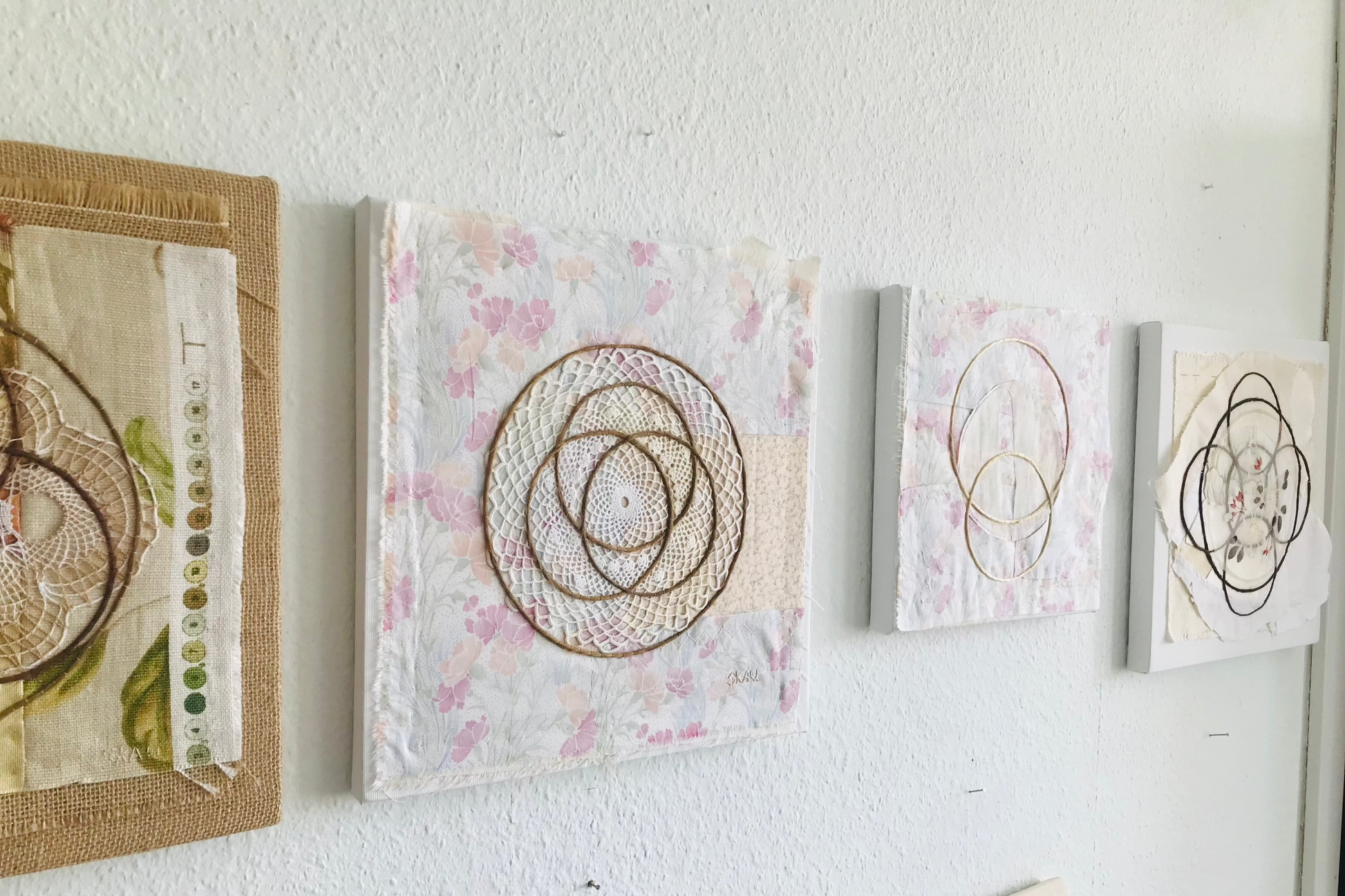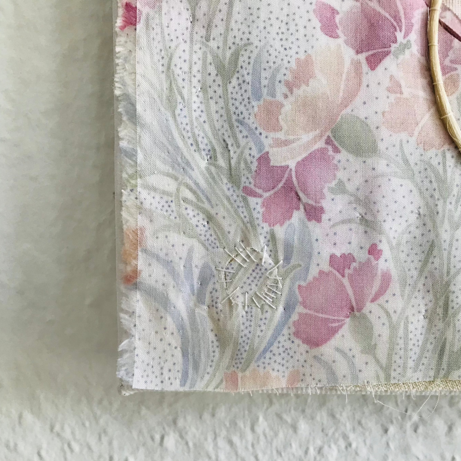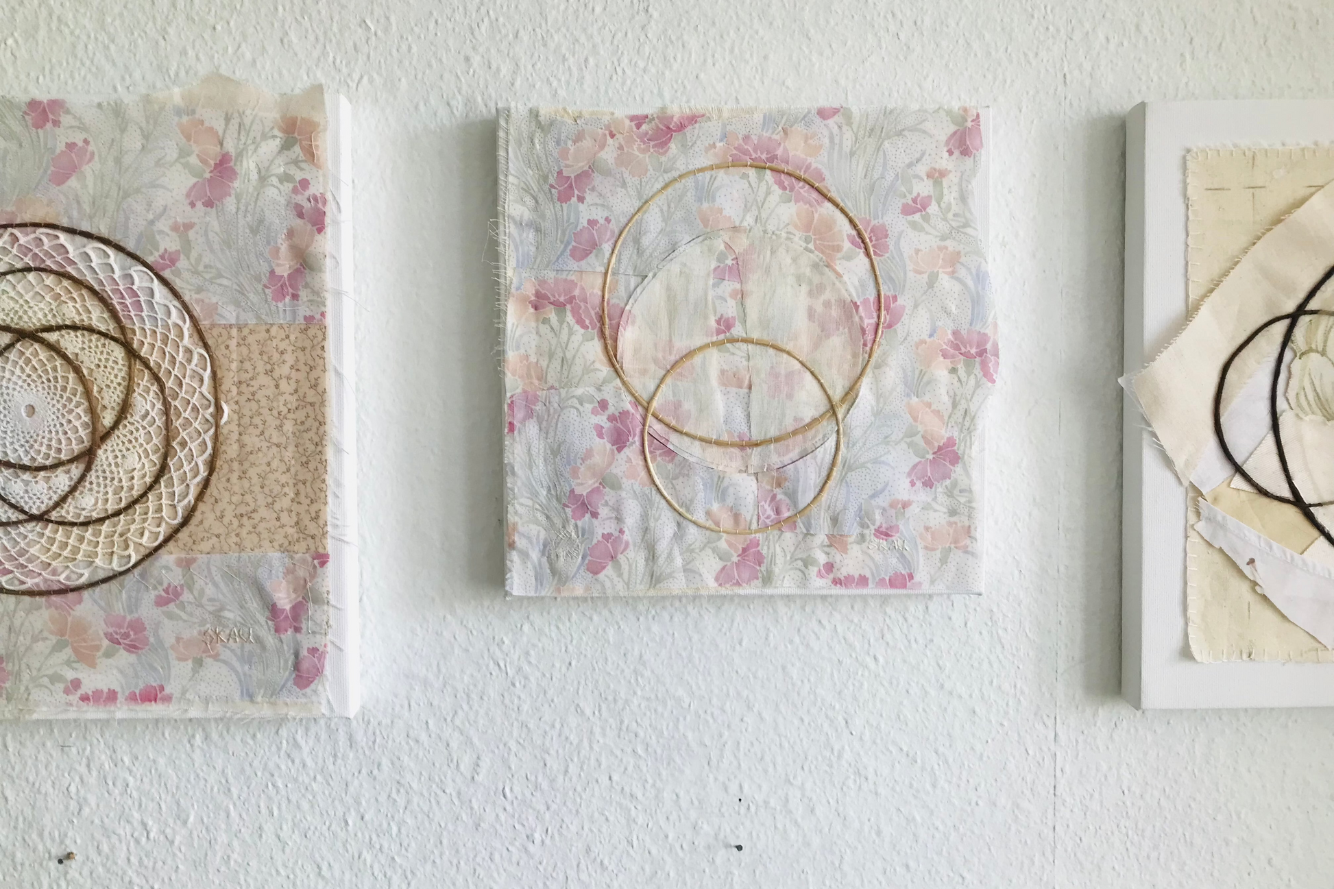 Liberty fabric, 2 circles of human hair, cheesecloth.