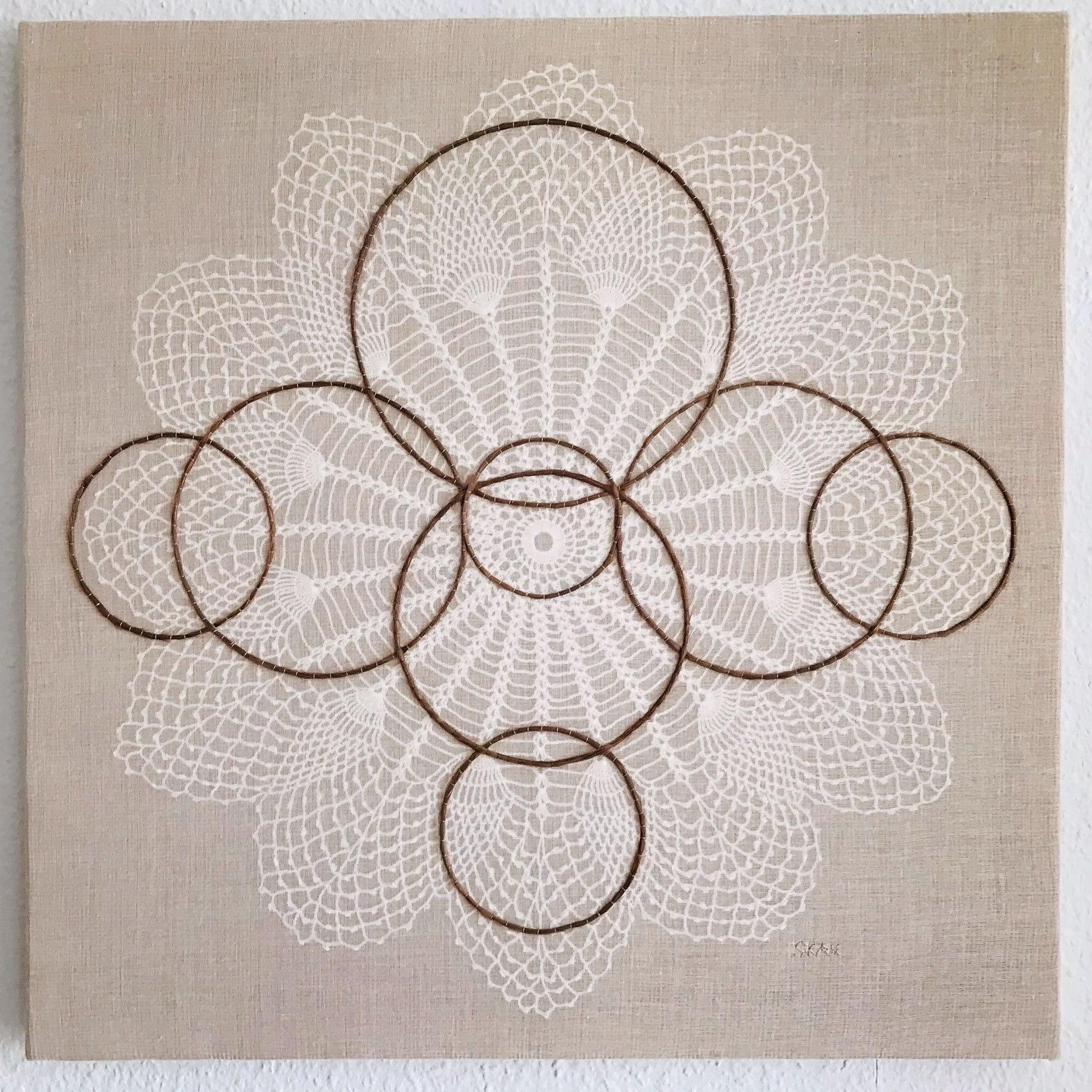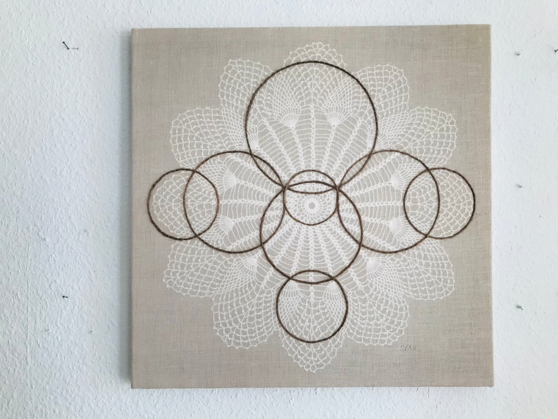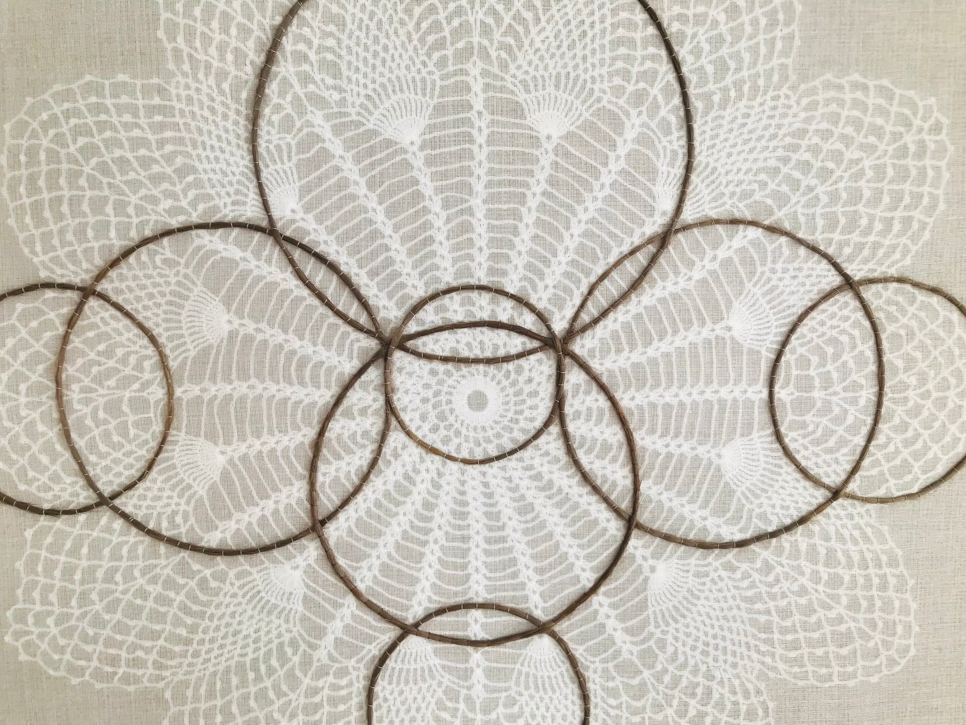 Travaux d'aiguille, 8 cercles de chevaux humains, et tissu étamine sur toile de jute.