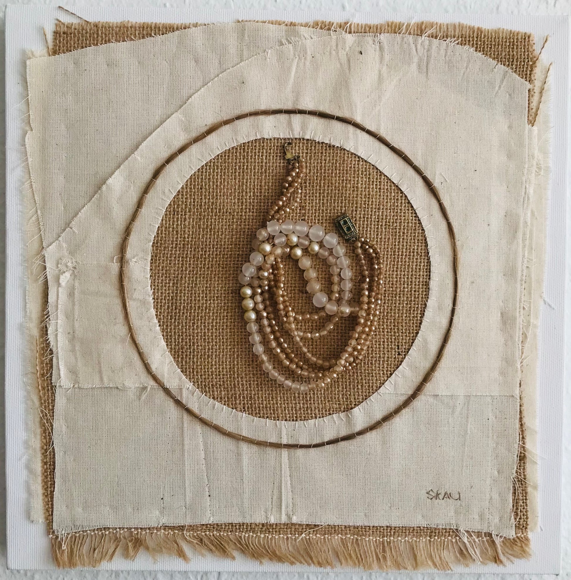 Travaux d’aiguille, tissu, cheveux humains, fil à coudre, un collier de perles.