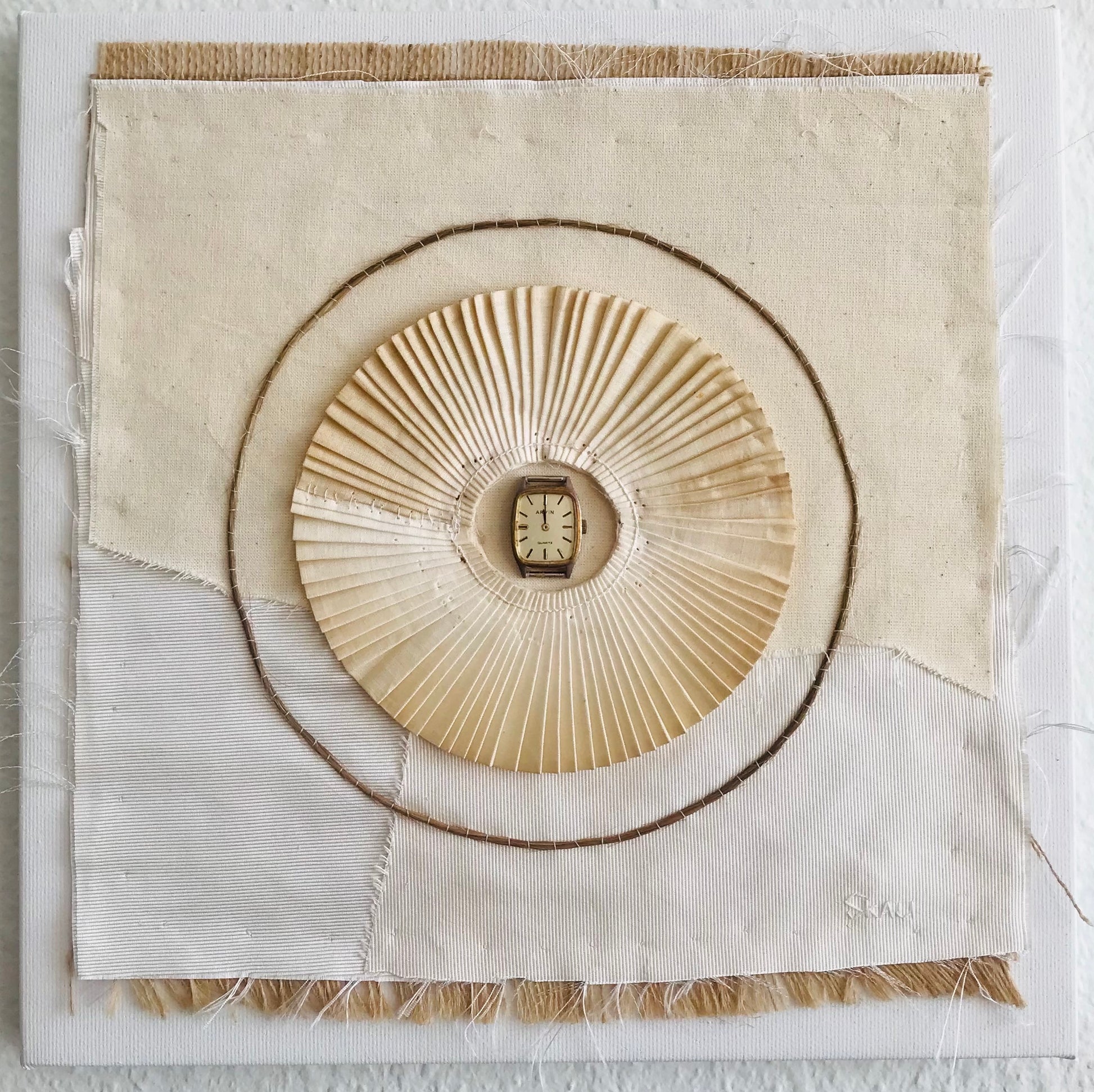Travaux d’aiguille, tissu, cheveux humains, fil à coudre, un cadran.